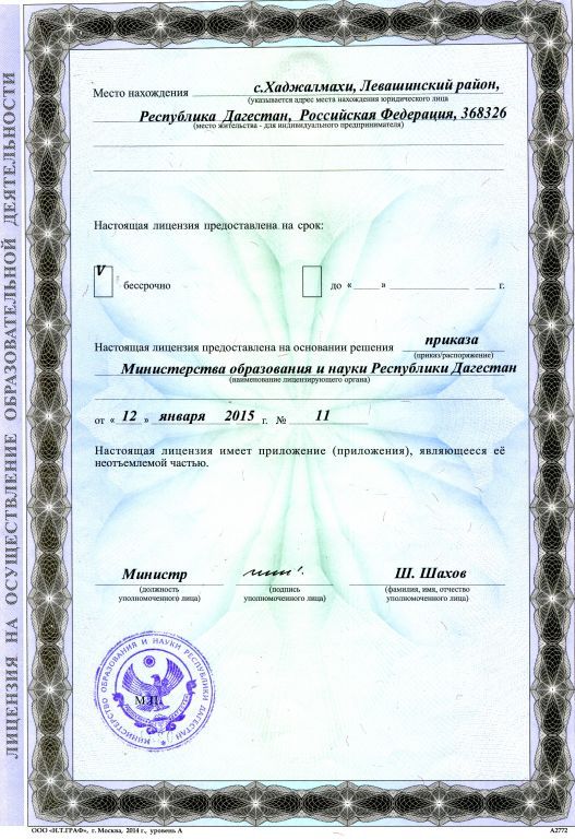 Адрес местонахождения образовательной организации* 368317, Республика Дагестан, Левашинский район, с. Хаджалмахи ул. Кара Караева д.№6